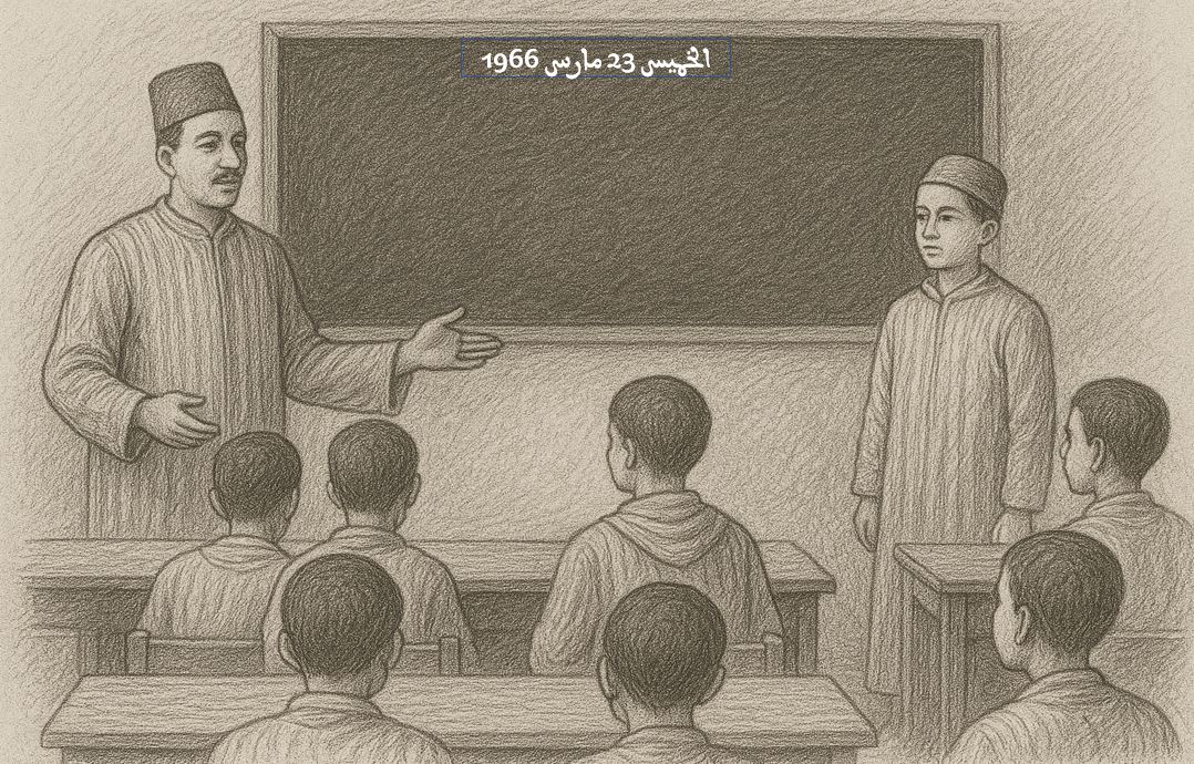 دخل الأستاذ سي نميق إلى حجرة القسم بخطواتٍ واثقة وصوتٍ جهوري، وكان الدرس مخصّصًا لتعلّم حرف التاء، جلس التلاميذ في صمت، وكلٌّ منهم أمامه محبرة، والريشة التي تنتظر الغمس.